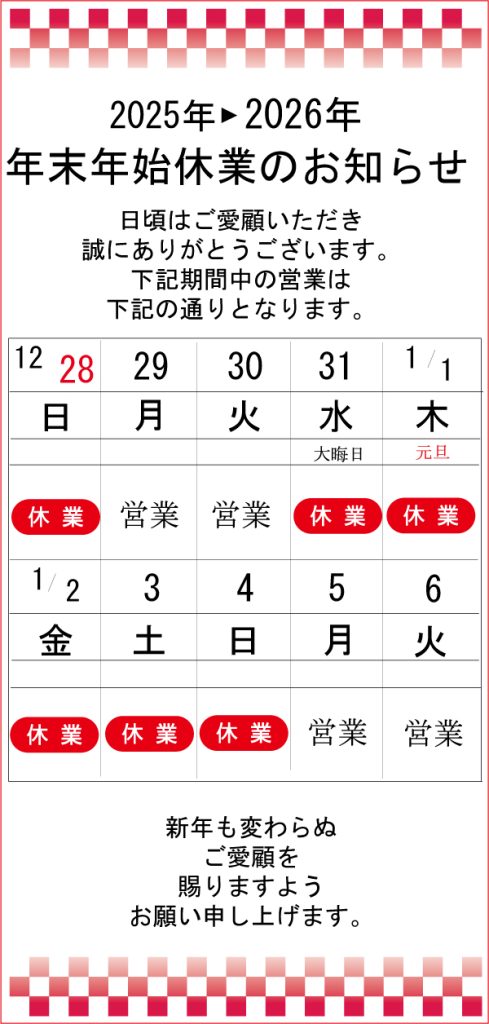 年末年始期間の営業に関しまして、下記の通りご案内いたします。